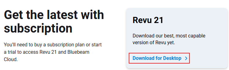 1. You will need to download the installer from their website at BlueBeam.com/download. Click on 'Download for Desktop' underneath the 'Revu 21' banner (see below).