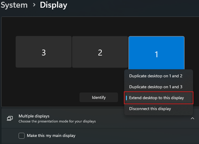 Once you're in Display settings, you may have to change the setting to 'Extend Desktop to this Display." To change that, there is a drop-down menu right next to the 'Identify' button that houses the setting we'll want to set it to (see below).