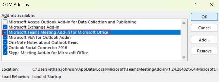 - On the COM Add-ins window, ensure that 'Microsoft Teams Meeting Add-in for Microsoft Office' is enabled. If it's not, go ahead and click the checkbox and then click OK (see below).