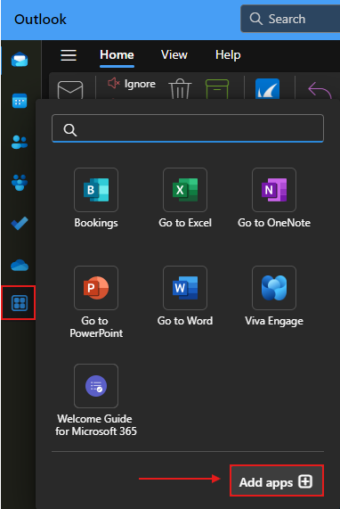 - With Outlook open, click on the 2x2 box icon along the left-hand pane, and then click on 'Add apps' (see below).