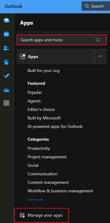- When you're in the Apps window of the new Outlook, you can either search for add-ins to add through the search bar at the top, or you can manage add-ins in use by using the button at the bottom "Manage your apps."